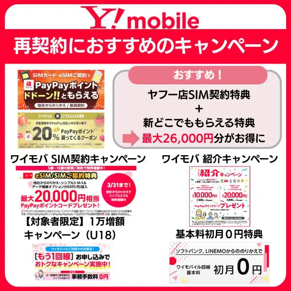 ワイモバイルをお得に再スタートしたい方は、再契約におすすめのキャンペーン情報をチェックしてみてください。