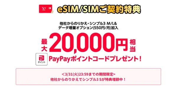 ワイモバイルでは、SIM/eSIM単体契約で新規またはソフトバンク回線以外から乗り換えをすると、最大20,000円相当のPayPayポイントがもらえるキャンペーン中です。