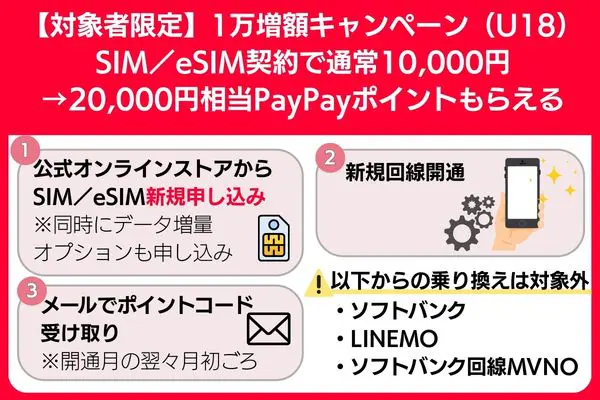 ![]() ワイモバイル オンラインストア SIM契約特典 | SIM単体契約+データ増量オプションで最大20,000円相当のPayPayポイントコード |