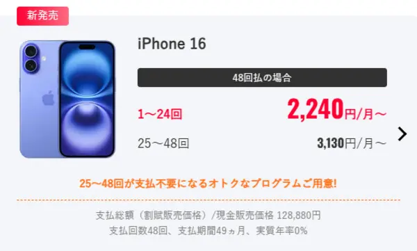具体的には、iPhone 16(128GB)の通常価格は145,440円ですが、新トクするサポート(A)を利用すれば24回目までの支払いが月額2,240円です。