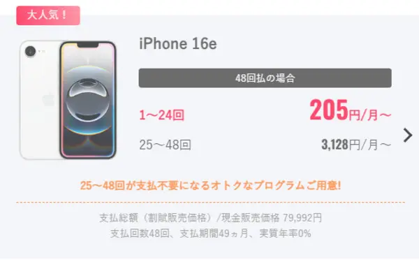 本プログラムでは、対象機種を48回払いで購入することから始まります。
