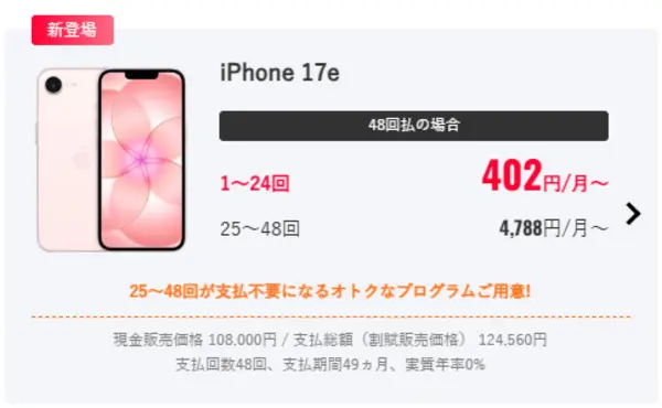 対象機種を48回払いで購入することが条件となります。