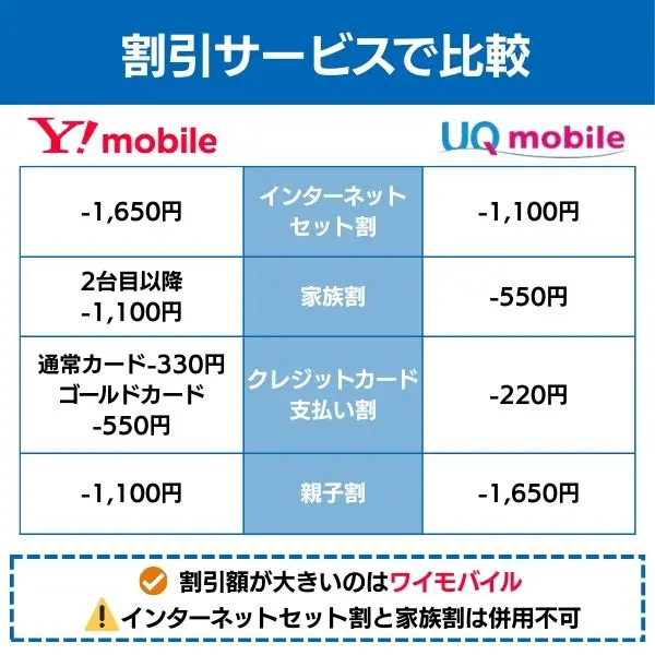 ワイモバイルとUQモバイルを比較すると、60歳以上の割引特典に大きな差はほとんどありません。